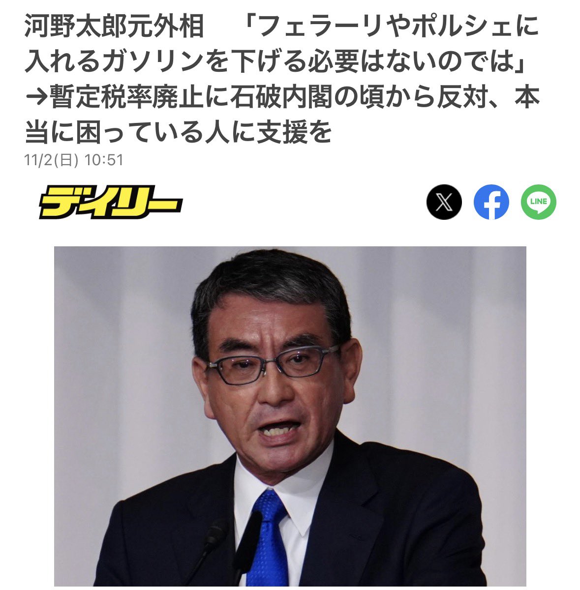 河野太郎元外相 「*ーリやポルシェに入れるガソリンを下げる必要はないのでは」→暫定税率廃止に石破内閣の頃から反対、本当に困っている人に支援を(デイリースポーツ) - Yahoo!ニュース https://share.google/rL1JmnNfPQnE4PD7N