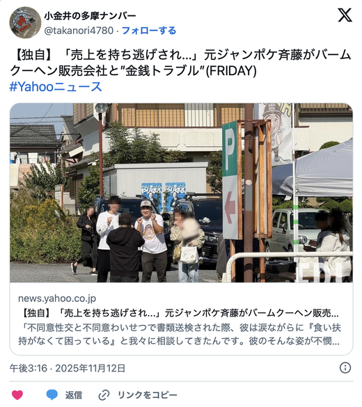 販売会社が「売り上げ金を持ち逃げされた」と被害届を提出へ...元『ジャンポケ』斉藤慎二のバームクーヘンを巡って金銭トラブルが勃発した