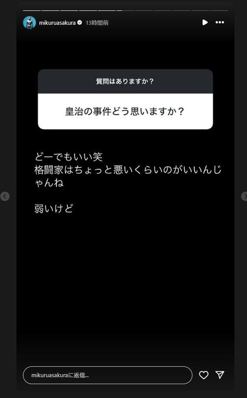 朝倉はフォロワーから「皇治の事件どう思いますか?」と尋ねられ、「どーでもいい笑」と返答。「格闘家はちょっと悪いくらいのがいいんじゃんね」と自身の考えを示しつつ、「弱いけど」とチクリとさした。