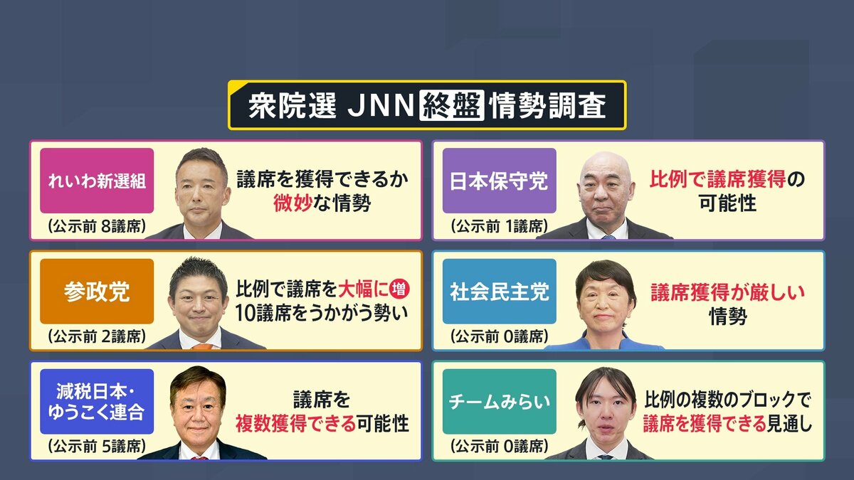 その他の政党です。共産党は公示前議席の確保は厳しい見通し。減税日本・ゆうこく連合は小選挙区で複数議席を獲得する可能性。れいわ新選組は公示前議席から大きく割り込むとみられ、厳しい戦いを強いられています。また、日本保守党も議席を確保できるかギリギリの戦いです。社会民主党は議席獲得が難しい情勢です。
