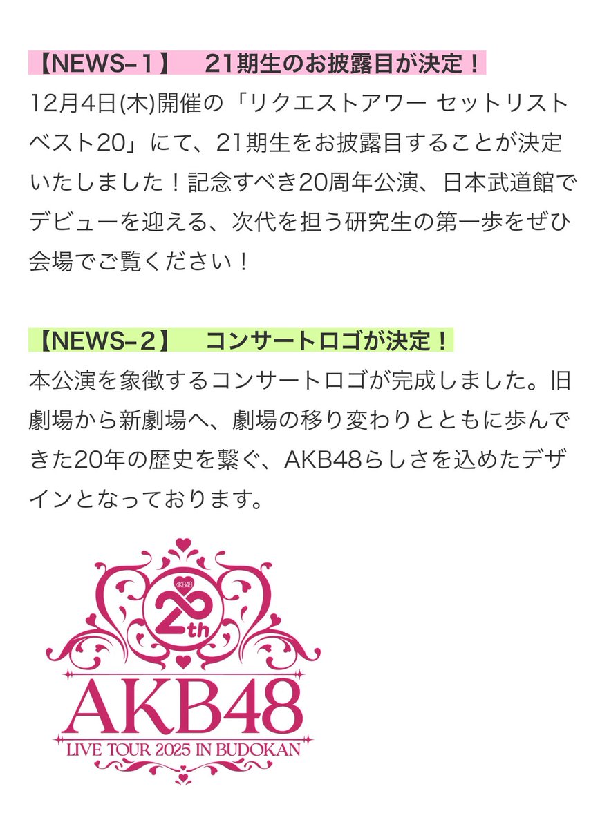 いよいよ開催まで一ヶ月を切った「AKB48 20th Year Live Tour 2025 in 日本武道館」!公演を心待ちにしてくださっている皆さまに向けて、より一層お楽しみいただける盛りだくさんのお知らせをお届けいたします!